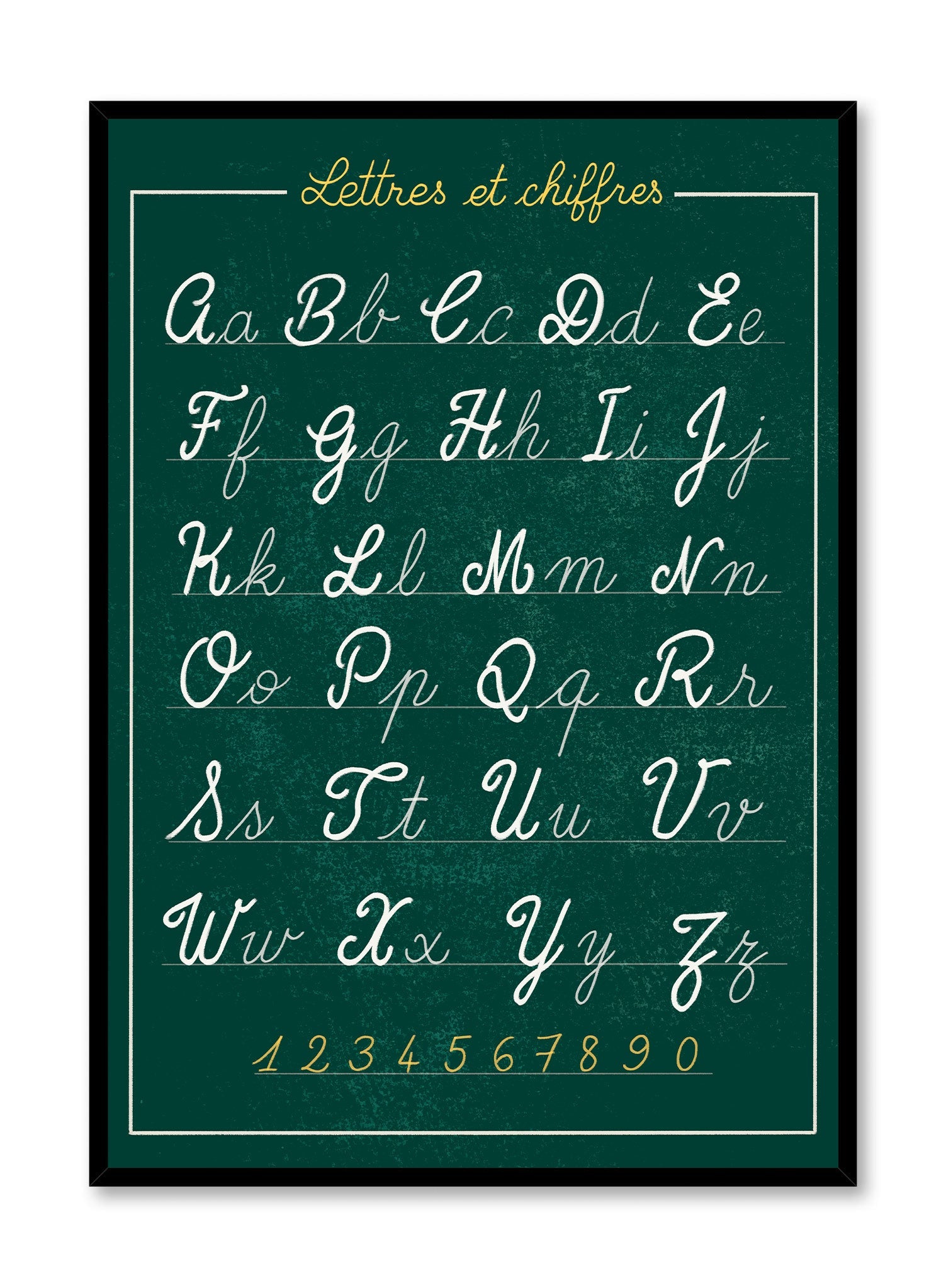 Introduce a touch of educational charm to your space with this French alphabet art print. Featuring elegant white cursive letters on a deep green chalkboard background, it's perfect for classrooms or learning nooks.