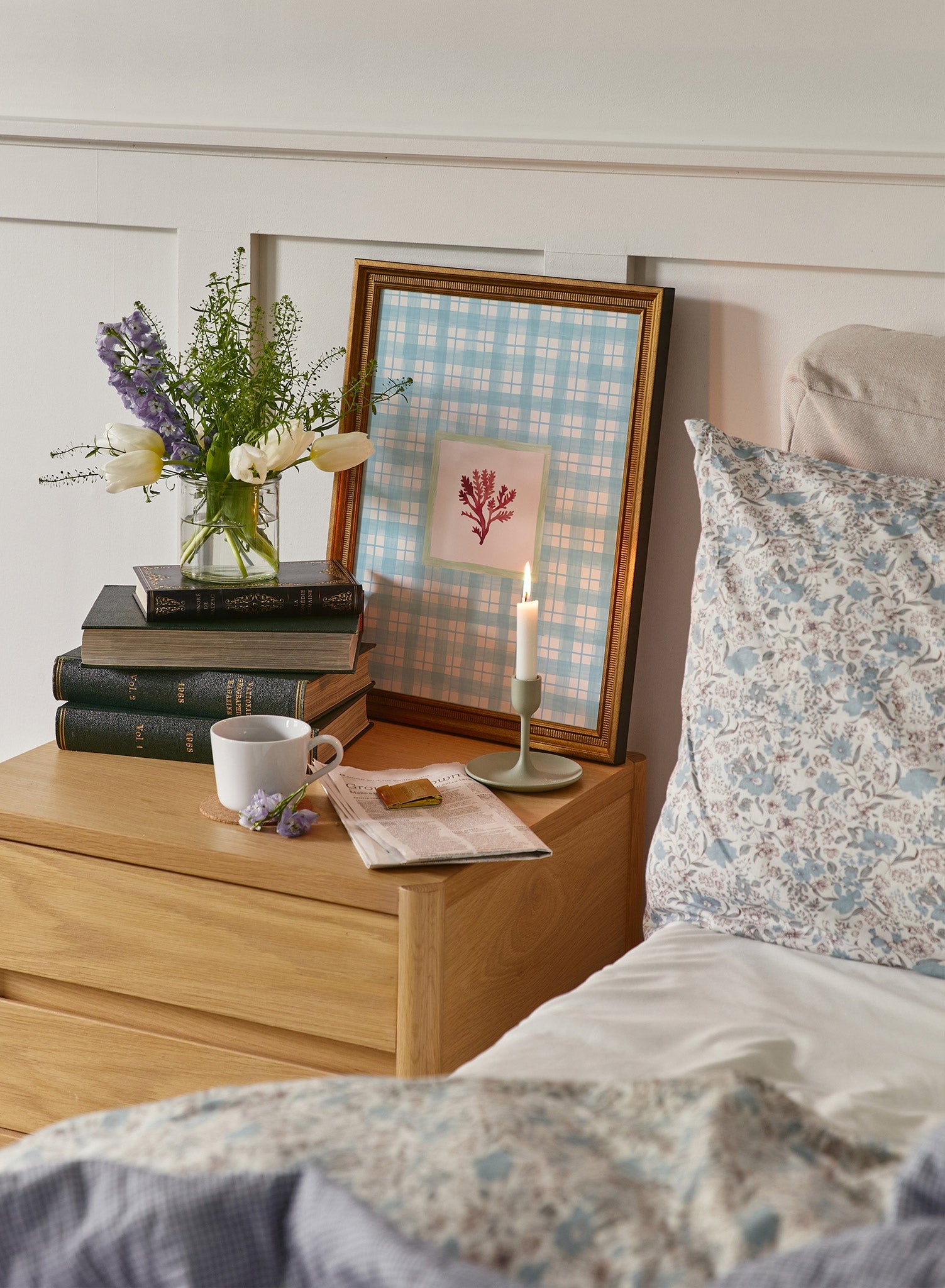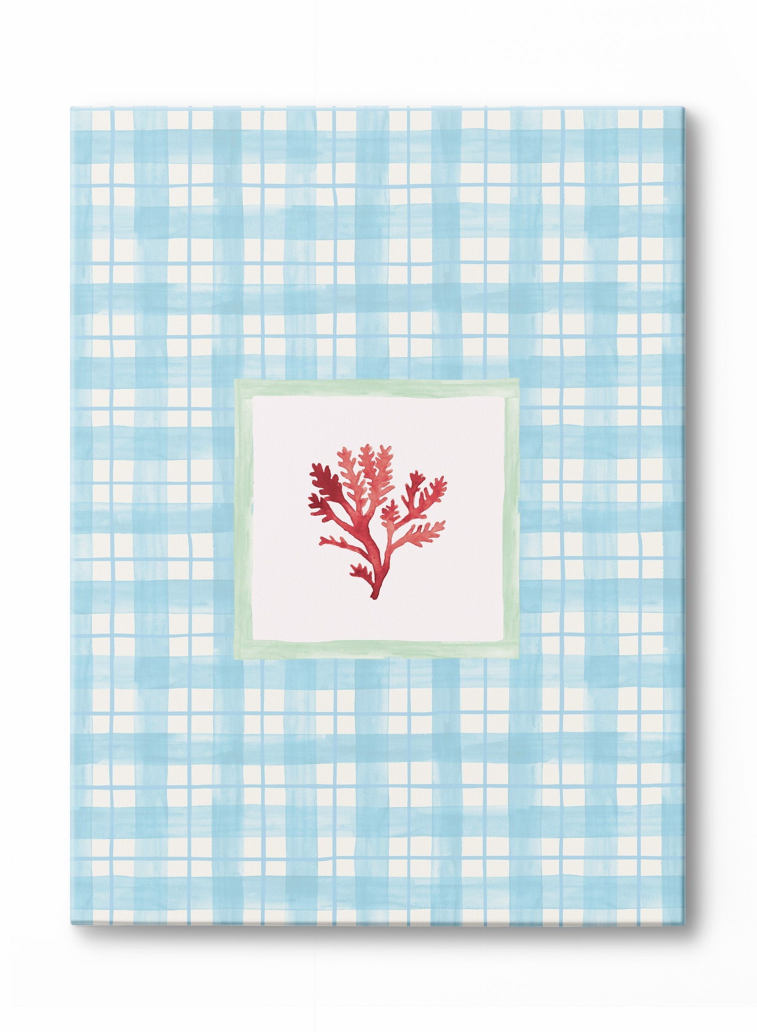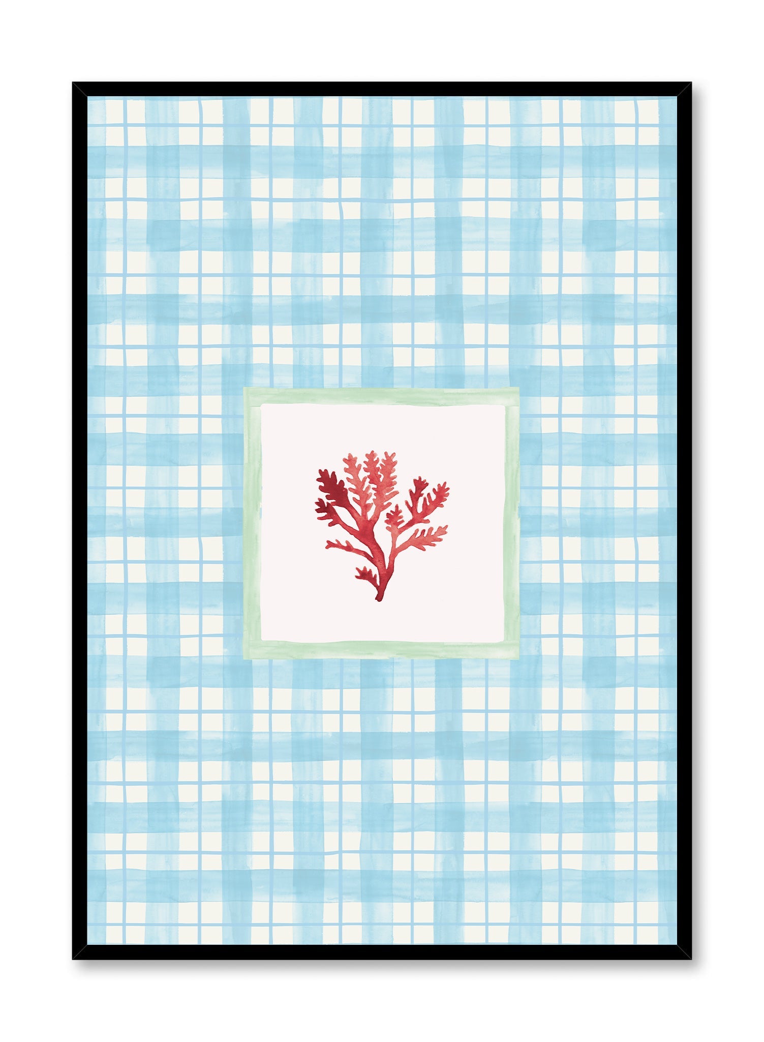 Fan of the coastal grandma trend? This one's for you! You'll love this art print of a red coral in a green squared frame surrounded by a delicate white and blue plaid pattern.