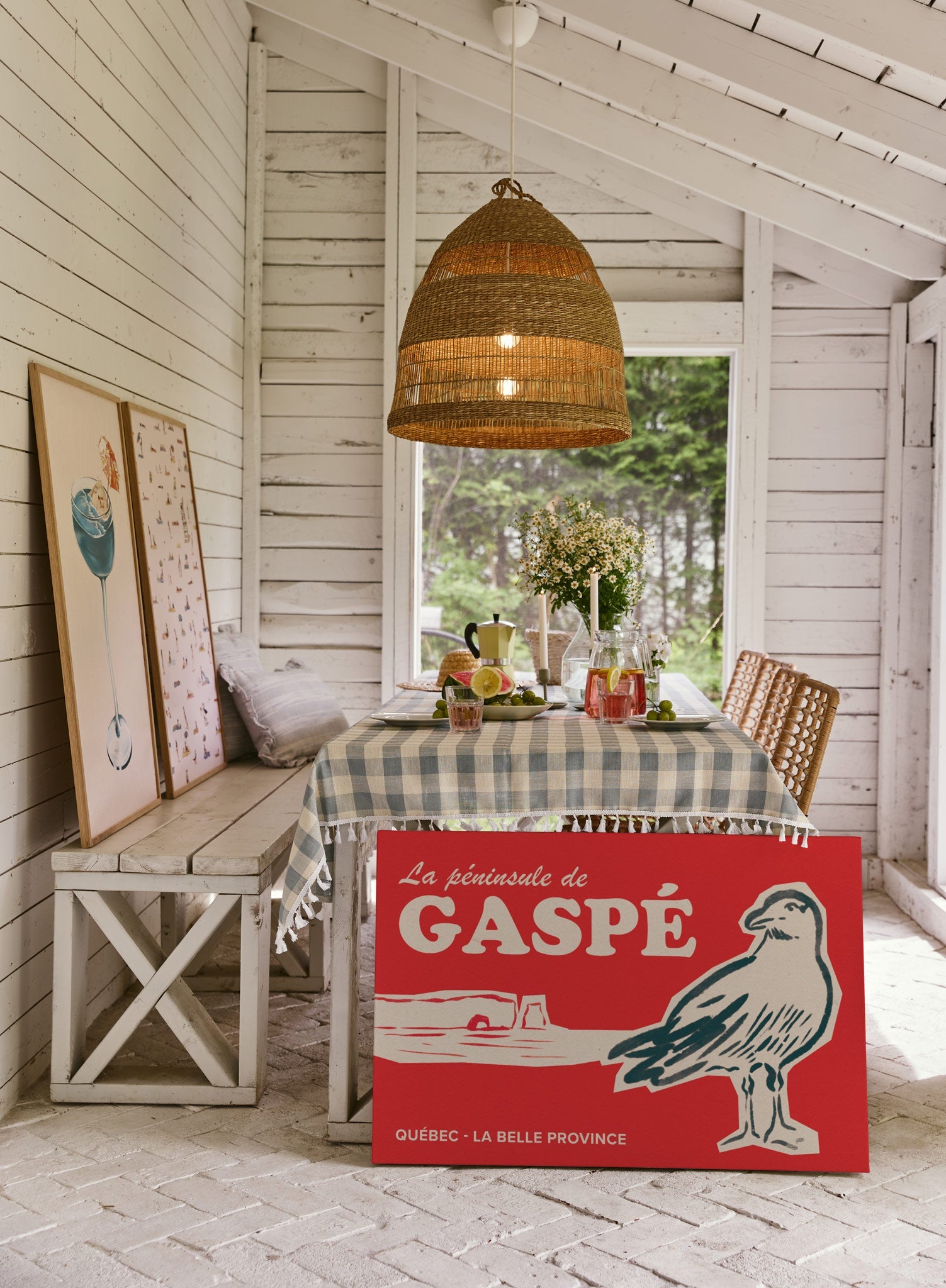 Next stop: Gaspé! This red poster celebrates Quebec's most beautiful seaside region with vintage lettering and a seagull illustration.