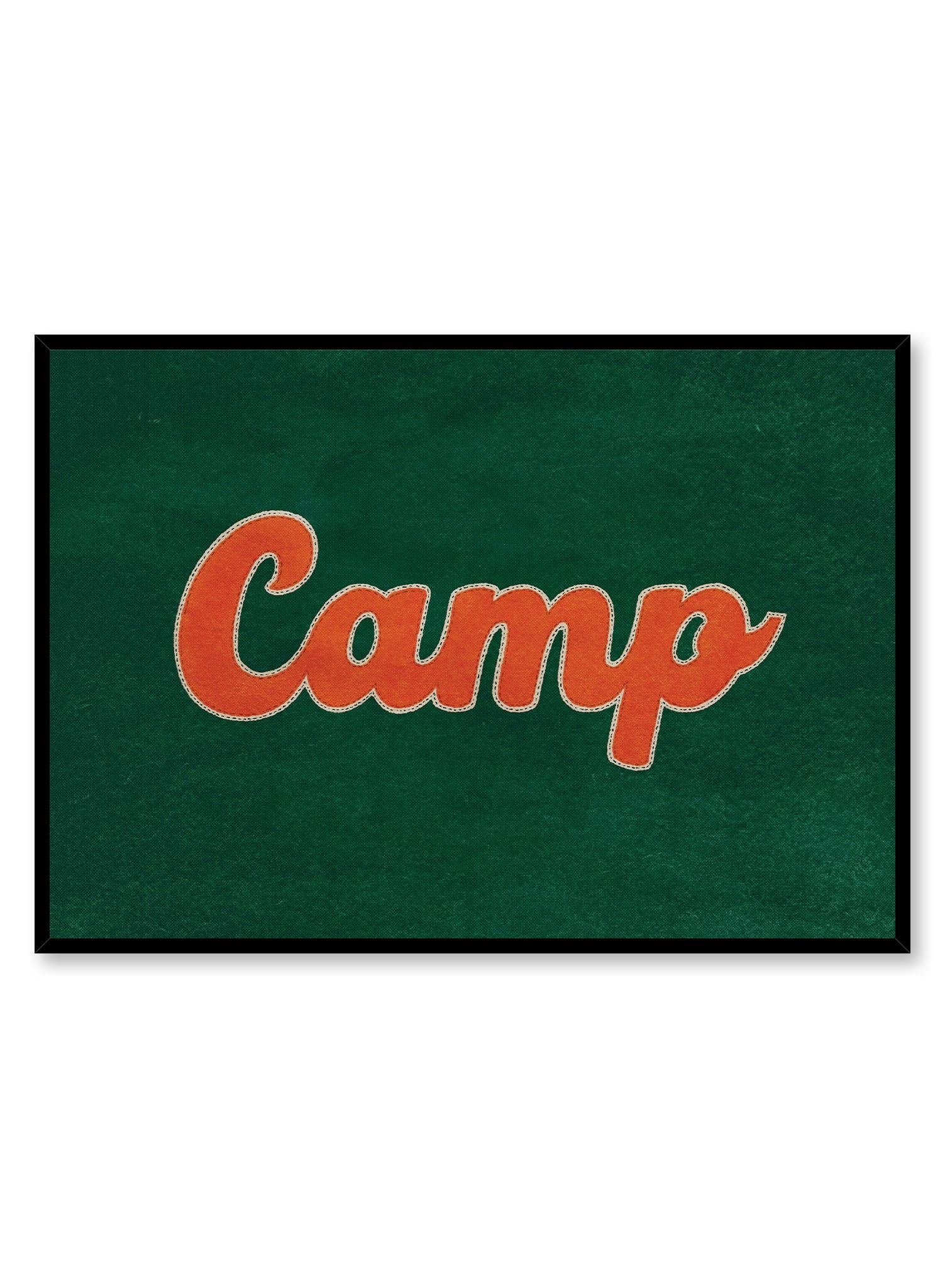 Add a playful touch to your decor with this simple yet bold 'Camp' art print. The orange text on a deep green background evokes memories of outdoor adventures and summer camps.